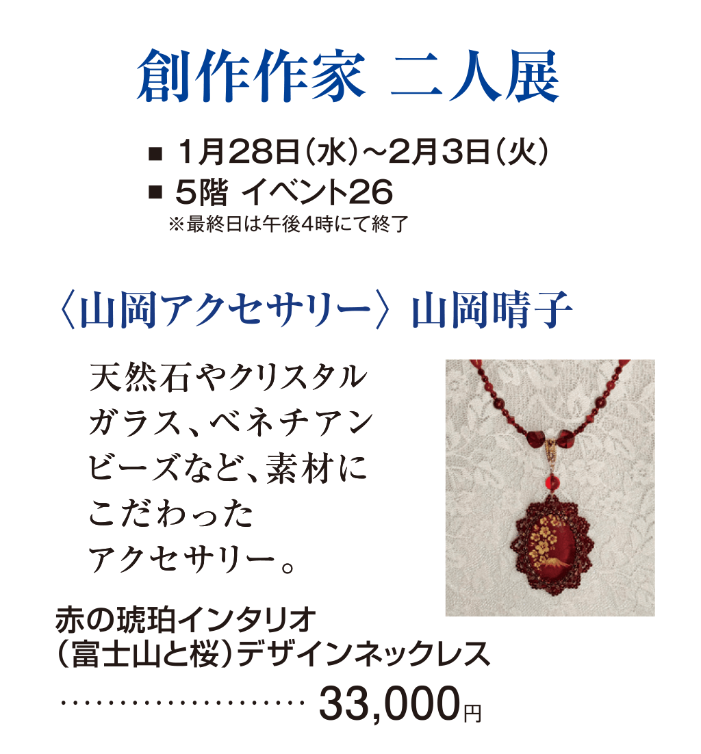 創作作家 二人展〈山岡アクセサリー〉山岡晴子 創作作家 二人展〈山岡アクセサリー〉山岡晴子 5F イベントスペース「イベント26」フロアマップ 2026年1月28日(水)~2月3日(火) ※最終日は午後4時にて終了