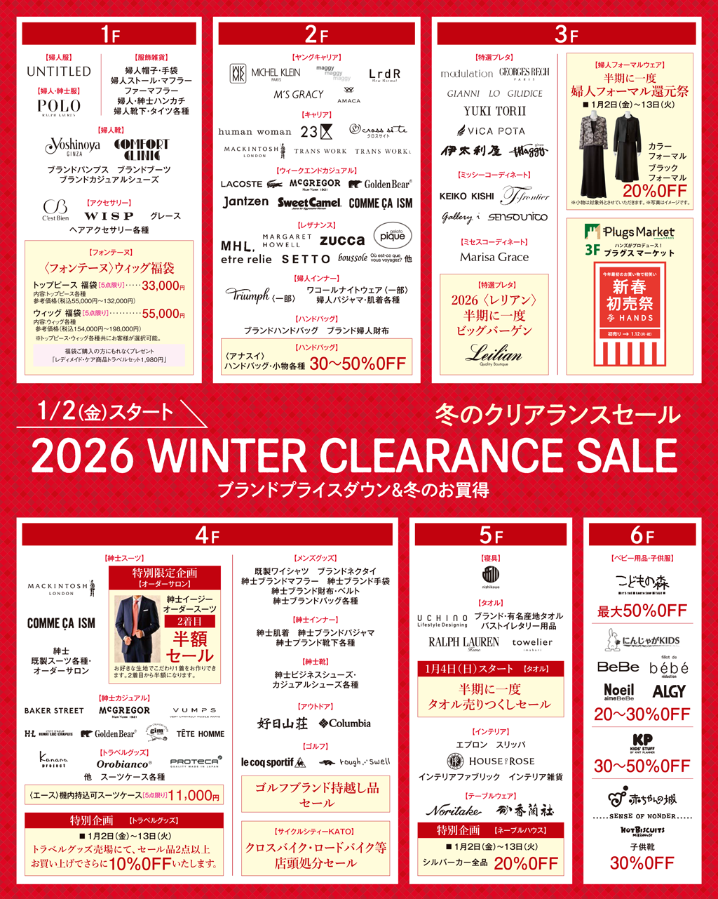 1/2(金)スタート 冬のクリアランスセール/2026 WINTER CLEARANCE SALE ブランドプライスダウン&冬のお買い得