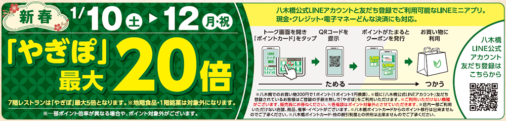新春「やぎぽ」最大20倍 新春「やぎぽ」最大20倍 ※7階レストランは5倍。 ※地階食品・1階銘菓は対象外となります。 ※一部ポイント倍率が異なる場合や、対象外がございます。 2026年1月10日(土)~1月12日(月)