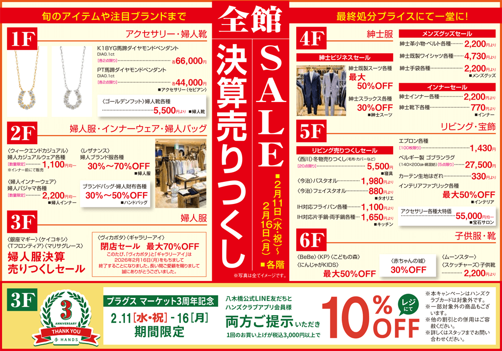 OPEN 午前10時~午後6時30分 ※2月16日(月)は棚卸のため全館午後5時にて閉店させていただきます。※ショップにより閉店時間が異なることがございます。