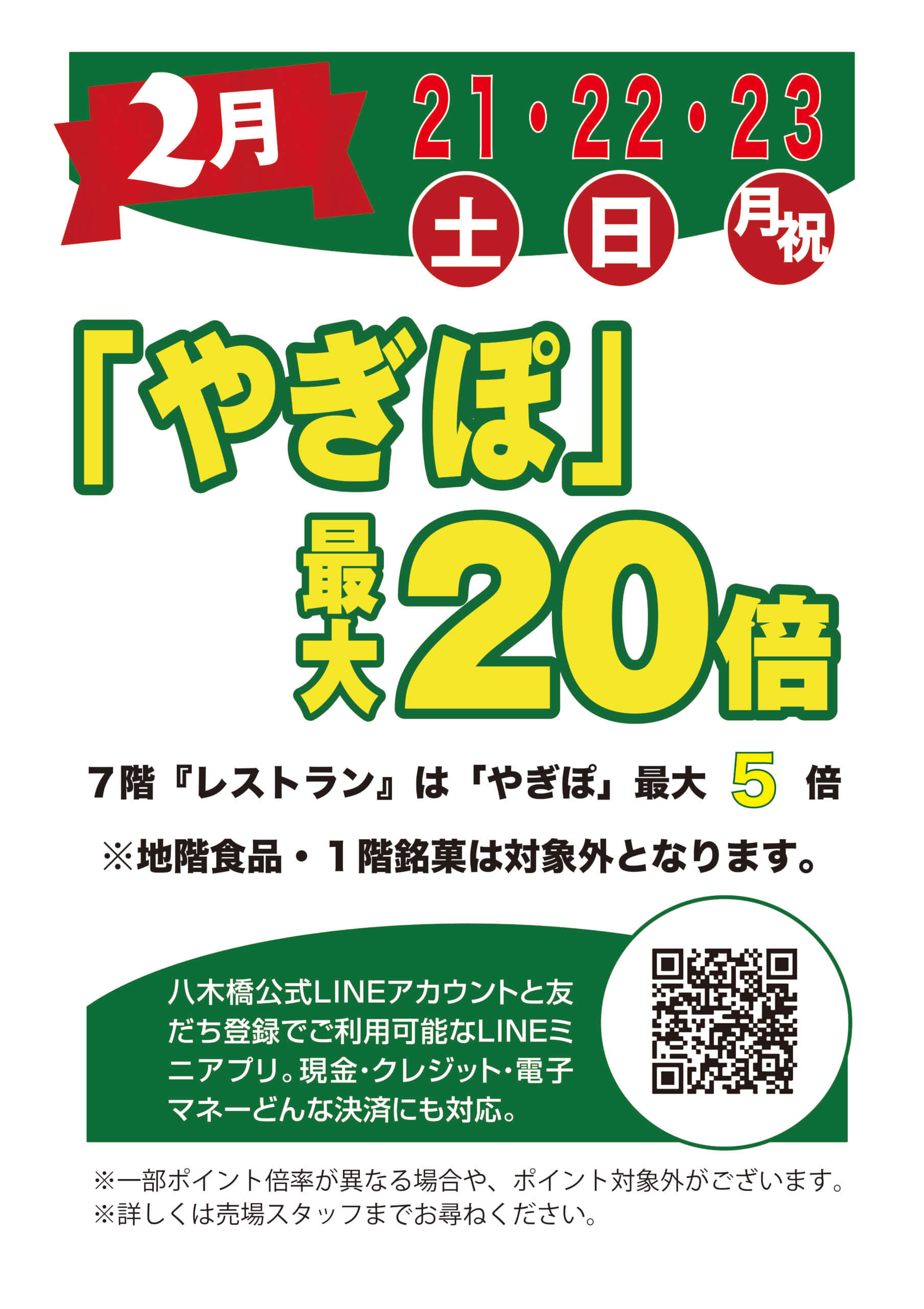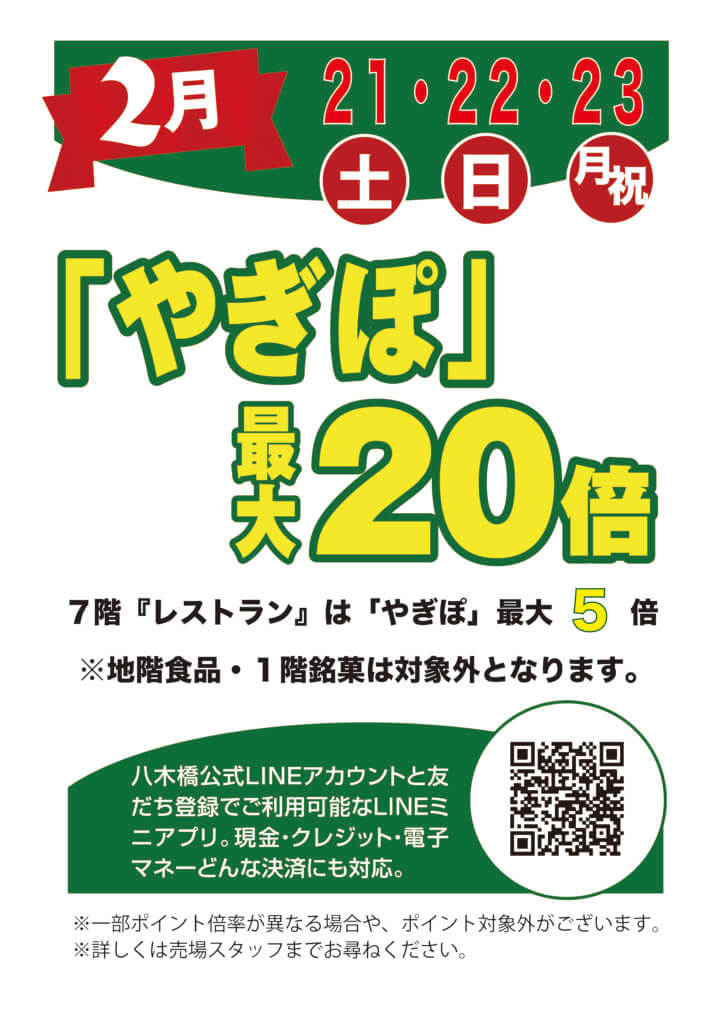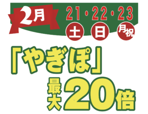 やぎぽ最大20倍 やぎぽ最大20倍 ※7階レストランは最大5倍。※地階食品、1階銘菓は対象外となります。※一部ポイント倍率が異なる場合や、ポイント対象外がございます。 2026年2月21日(土)~2月23日(月)