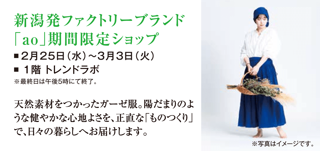 新潟発ファクトリーブランド「ao」期間限定ショップ 新潟発ファクトリーブランド「ao」期間限定ショップ 1F 西口イベントスペース「トレンドラボ」フロアマップ 2026年2月25日(水)~3月3日(火) ※最終日は午後5時にて終了