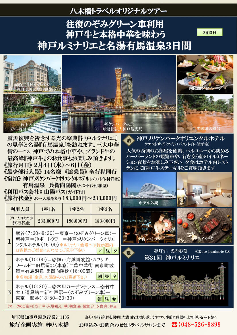往復のぞみグリーン車利用「神戸牛と本格中華を味わう神戸ルミナリエと名湯有馬温泉3日間」