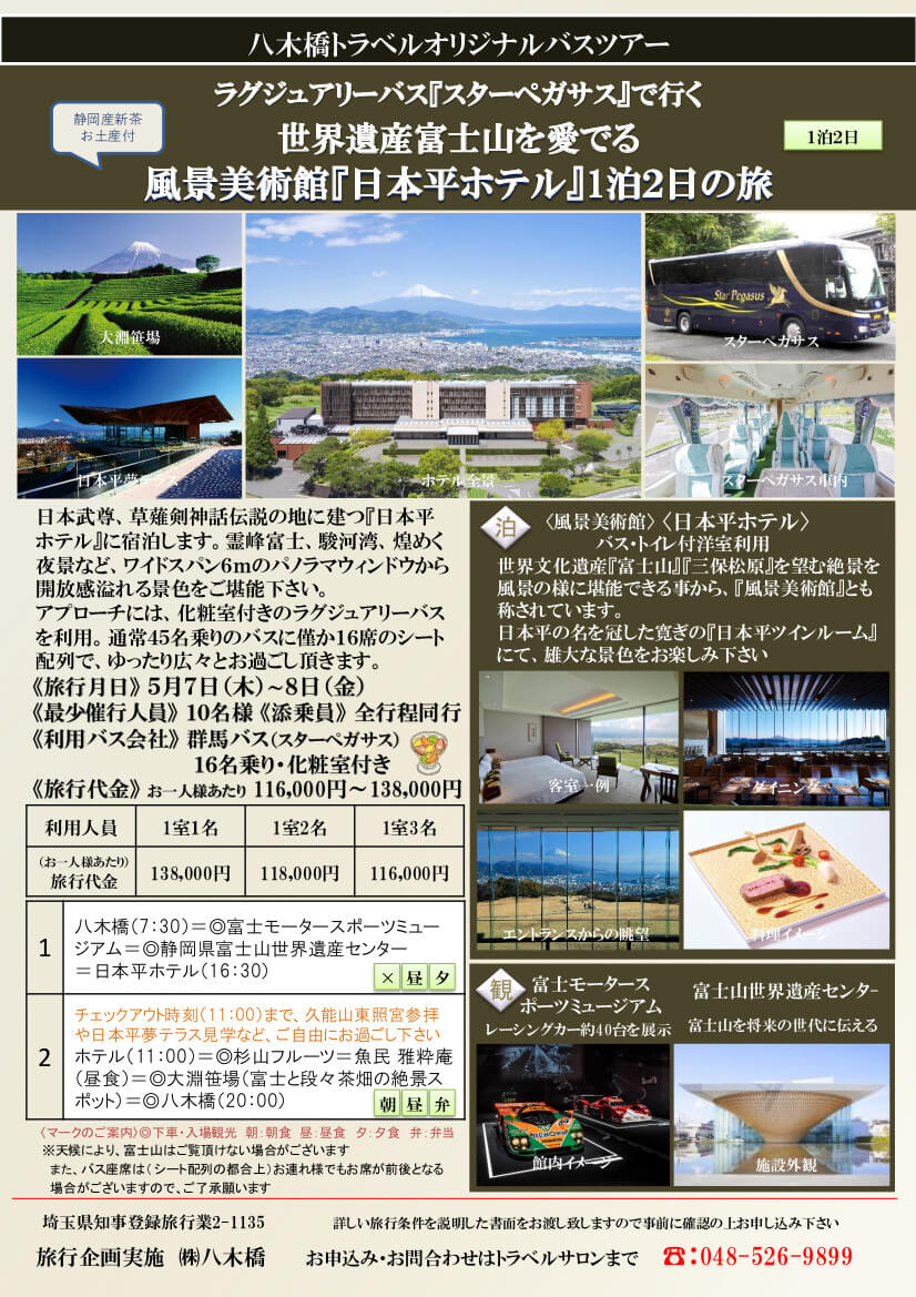 ラグジュアリーバス「スターペガサス」で行く 世界遺産富士山を愛でる 風景美術館「日本平ホテル」1泊2日の旅